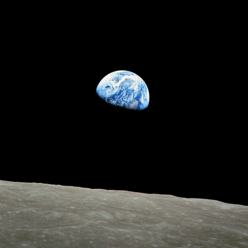 The second image is a photo taken 40 years ago by Apollo 8 crewmember Bill Anders on December 24, 1968, showing the Earth seemingly rising above the lunar surface. Note that this phenomenon is only visible from someone in orbit around the Moon. Because of the Moon’s synchronous rotation about the Earth (i.e., the same side of the Moon is always facing the Earth), no Earthrise can be visible from the surface of the Moon.